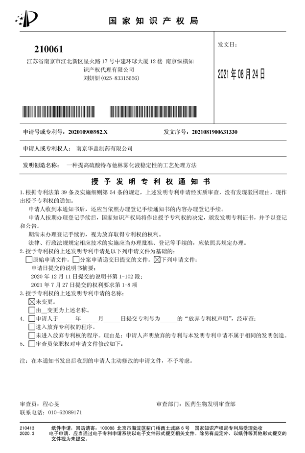 2021年8月24日,我公司申請的發(fā)明專利“一種提高硫酸特布他林霧化液穩(wěn)定性的工藝處理方法”收到了專利授權通知。此項發(fā)明專利提供了一種更為穩(wěn)定的硫酸特布他林霧化液的生產(chǎn)工藝,通過該工藝,降低了生產(chǎn)成本,同時提高了藥品質(zhì)量。