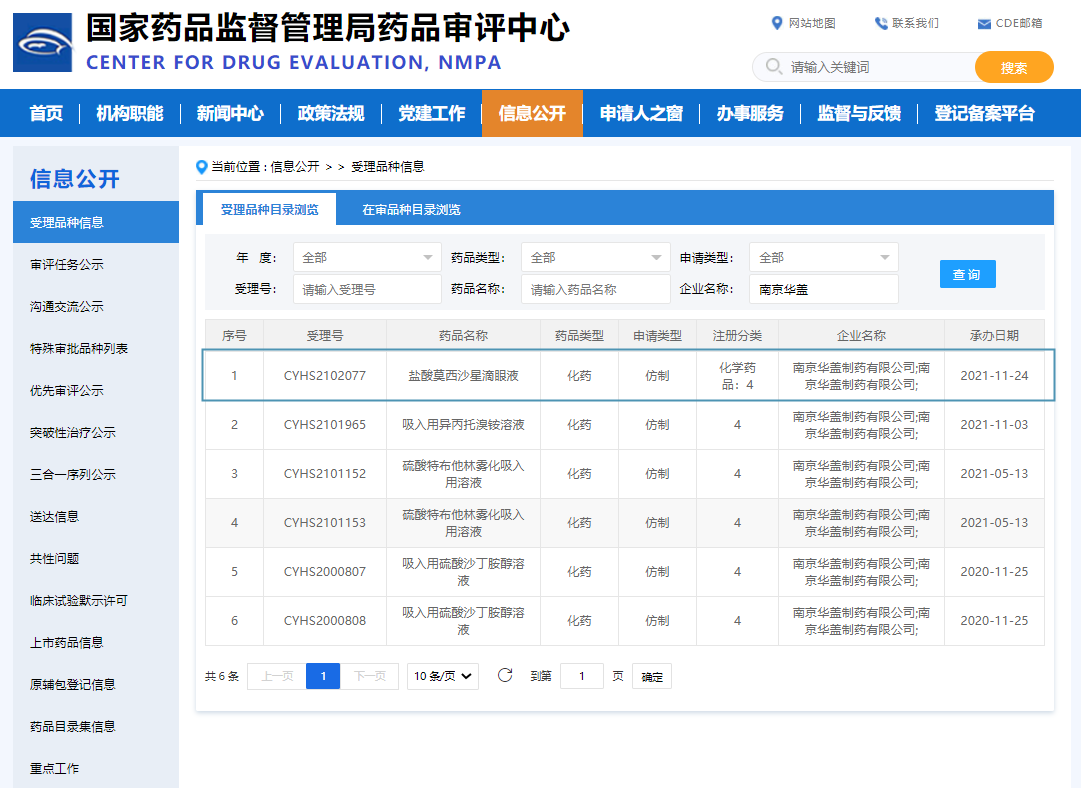 2021年11月24日,南京華蓋制藥有限公司研制的“鹽酸莫西沙星滴眼液”在國家藥品監(jiān)督管理局審評中心受理,受理號為CYHS2102077。