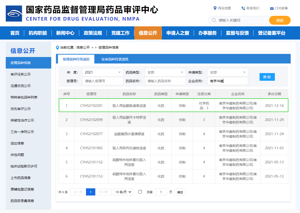 2021年12月16日,南京華蓋制藥有限公司研發(fā)的吸入用鹽酸氨溴索溶液(2ml:15mg)在國(guó)家藥品監(jiān)督管理局審評(píng)中心的受理,受理號(hào)為CYHS2102201。
