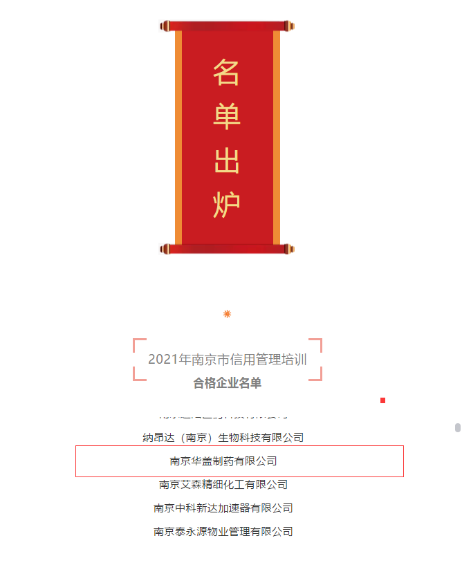 喜訊!南京華蓋制藥有限公司通過2021年南京市信用管理培訓(xùn)合格企業(yè)