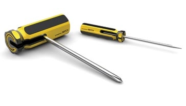 好的產(chǎn)品設(shè)計(jì),即能滿足人們?nèi)粘I钚枰?,也能?jié)省材料,在大多數(shù)人的概念里,螺絲刀和小榔頭是兩種工具(上圖),設(shè)計(jì)師巧妙的發(fā)現(xiàn)人們的情感需求,將兩件工具合二為一。