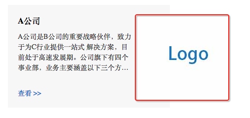 1 <style> 2 .container { 3 margin: 50px auto; 4 width: 328px; 5 } 6 7 .box { 8 background: #f7f7f7; 9 position: relative; 10 } 11 12 .box-content { 13 padding: 20px; 14 width: 70%; 15 } 16 17 .box-content-title { 18 margin: 0 0 10px; 19 } 20 21 .box-content-desc { 22 -webkit-box-orient: vertical; 23 color: #333; 24 display: -webkit-box; 25 font-size: 14px; 26 line-height: 1.5; 27 -webkit-line-clamp: 4; 28 margin-bottom: 30px; 29 overflow: hidden; 30 text-overflow: ellipsis; 31 } 32 33 .box-content-link { 34 color: #006ec8; 35 font-size: 14px; 36 text-decoration: none; 37 } 38 39 .box-content-link:hover { 40 text-decoration: none; 41 } 42 43 .box-img { 44 position: absolute; 45 right: -38%; 46 top: 20px; 47 } 48 </style> 49 <div class="container"> 50 <div class="box"> 51 <div class="box-content"> 52 <h5 class="box-content-title">A公司</h5> 53 <div class="box-content-desc">A公司是B公司的重要戰(zhàn)略伙伴,致力于為C行業(yè)提供一站式